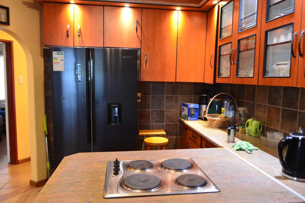 Relaxed family living in Khomasdal, Windhoek, with outdoor braai and built-in entertainment area, modern wooden-finish kitchen and air-conditioned lounge. Three bedrooms, two bathrooms, covered parking.