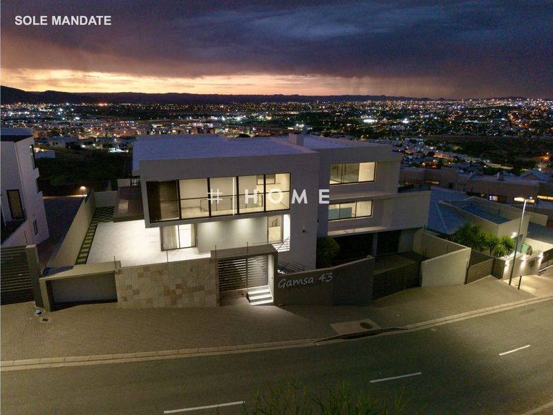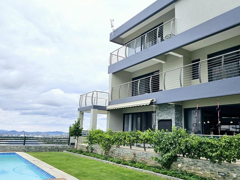 Entertainer's urban retreat on Gamsa Street’s top bend, enjoying sweeping Auas mountain and city views, top-floor swimming pool and elevator; four ensuite bedrooms and oversized double garage.