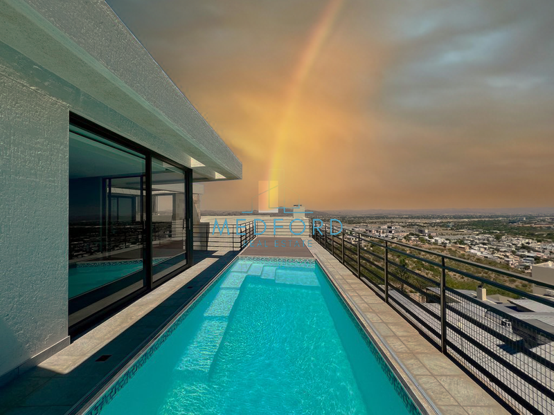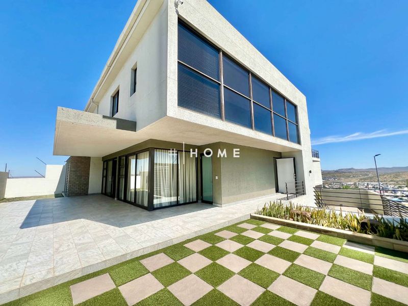 Panoramic Gamsa Street living in Windhoek with rooftop swimming pool and private lift, expansive indoor/outdoor flow, low-maintenance garden, four ensuite bedrooms and oversized double garage.