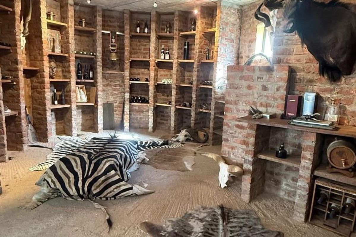 Rustic lodge-style living near nature in Ludwigsdorf, expansive 1,713m² plot with sprawling entertainment wing featuring a wine cellar; four bedrooms, three baths and automated five-car garage.