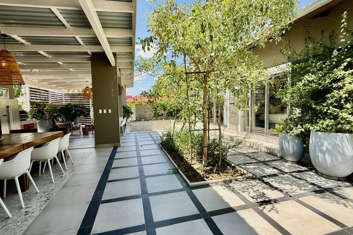 Effortless family living with panoramic porch views and lush garden; huge 59 m² covered entertainment area overlooks fishpond and boma with built-in BBQ. Three bedrooms, two baths, triple garage.