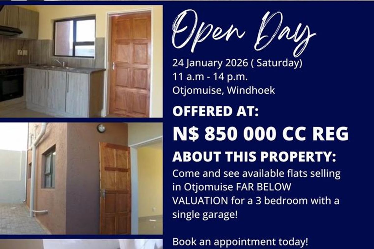 Community-focused living in Otjomuise, ideal for investors or families; double-storey flats with open-plan lounge, secure complex and single garage — three bedrooms, three bathrooms.
