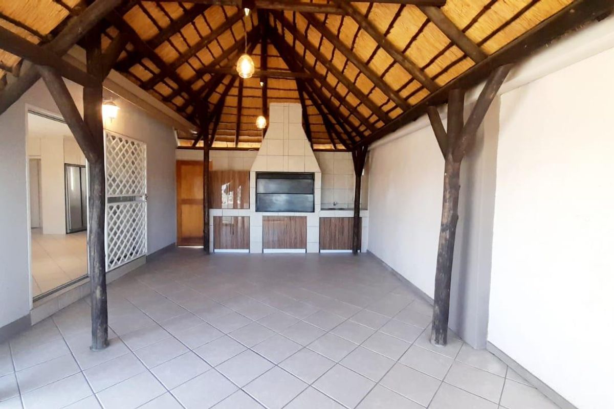 3 Bedrooms, 2 full bathrooms. Kitchen with open plan living, Opening on thatched lapa with build-in BBQ. Spacious garden, huge courtyard and 1 garage. Excellent security. Not pet friendly.