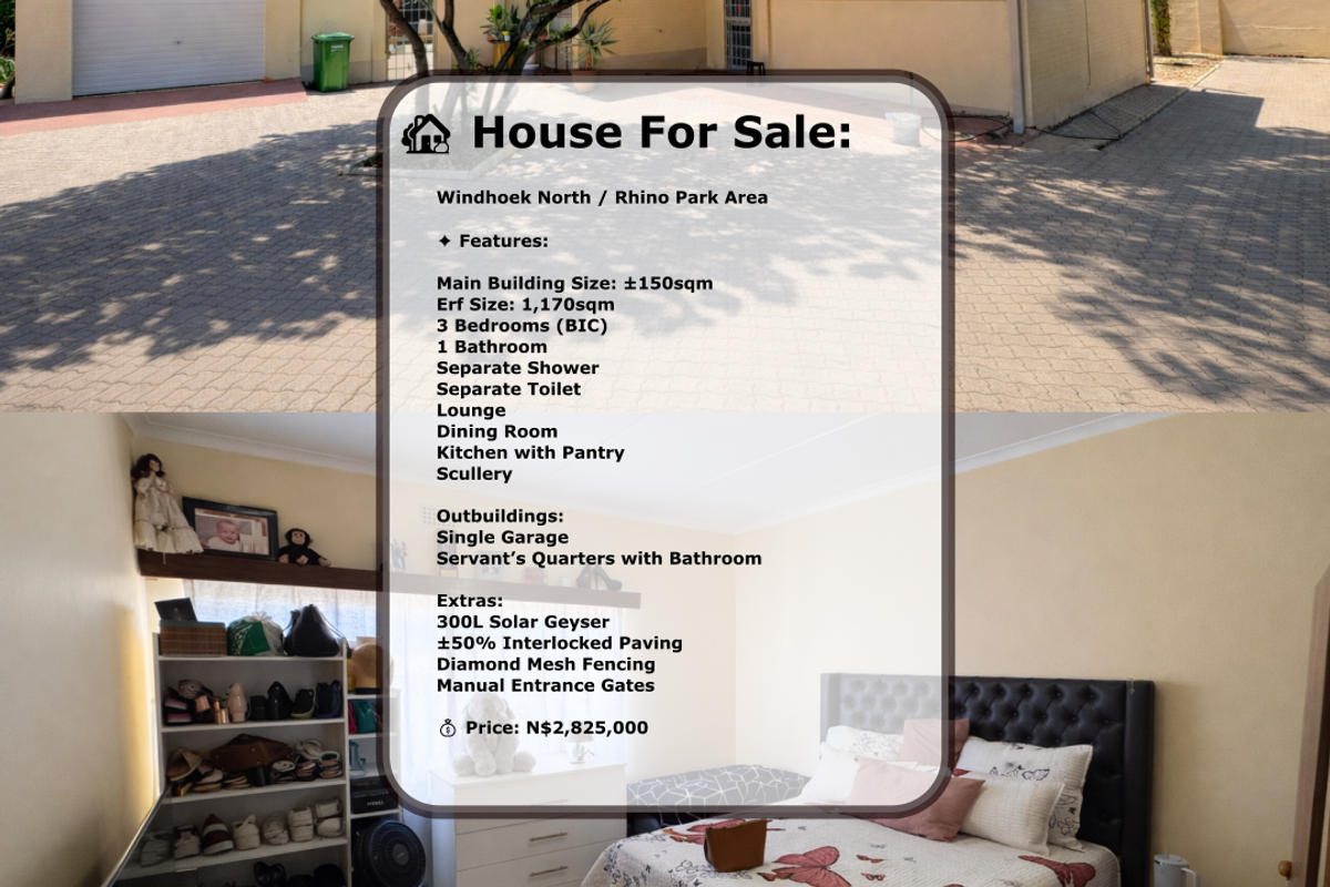 Situated in Windhoek North on a 1,170m2 erf, this above-average sized single-storey home offers generous living space, solid construction, and additional outbuildings with income potential.