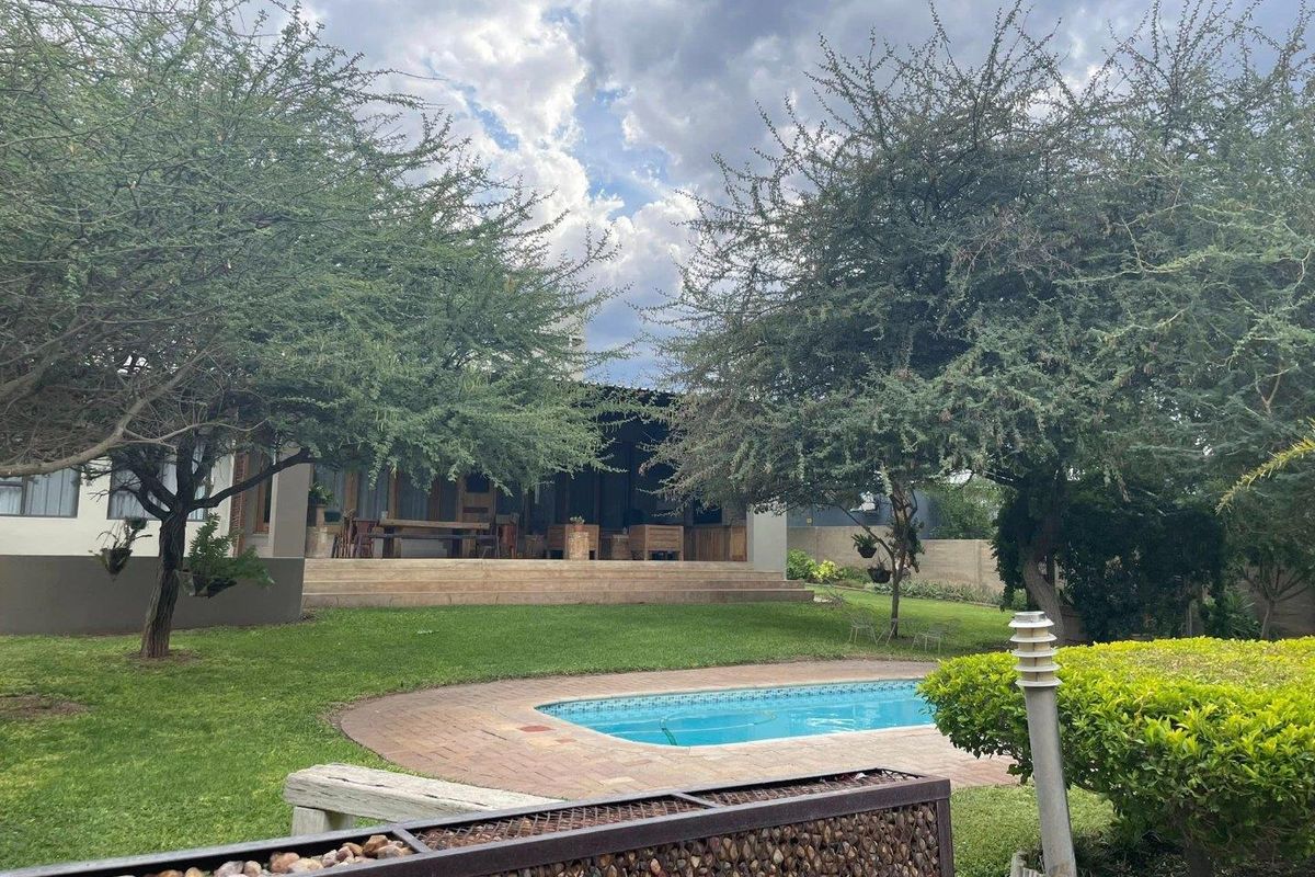 Relaxed family living in peaceful Outjo Ext 1 with expansive entertainment patio, boma and pool plus irrigated indigenous garden; five bedrooms, four bathrooms and triple garage.