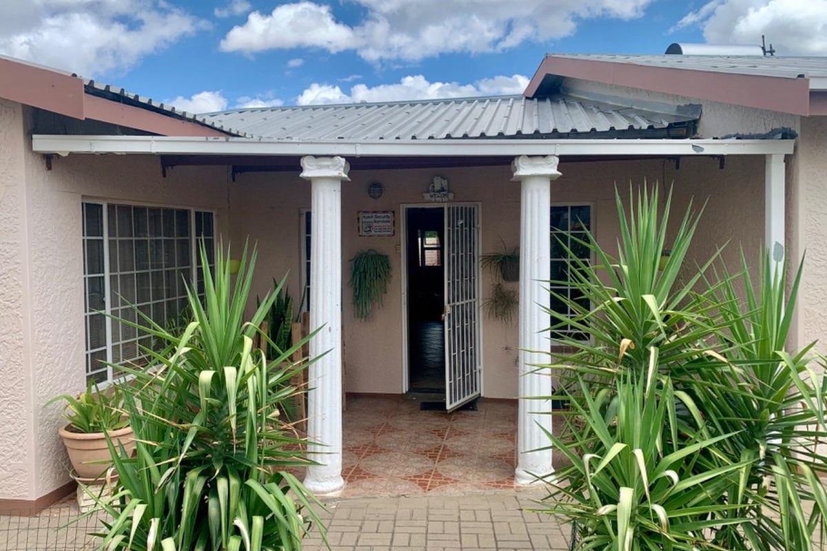 Entertainer's oasis within walking distance to Okahandja Shopping Centre—heated pool, thatched BBQ lapa and fruit trees on 1,300 m²; main house plus 2‑bed flat, double garage.