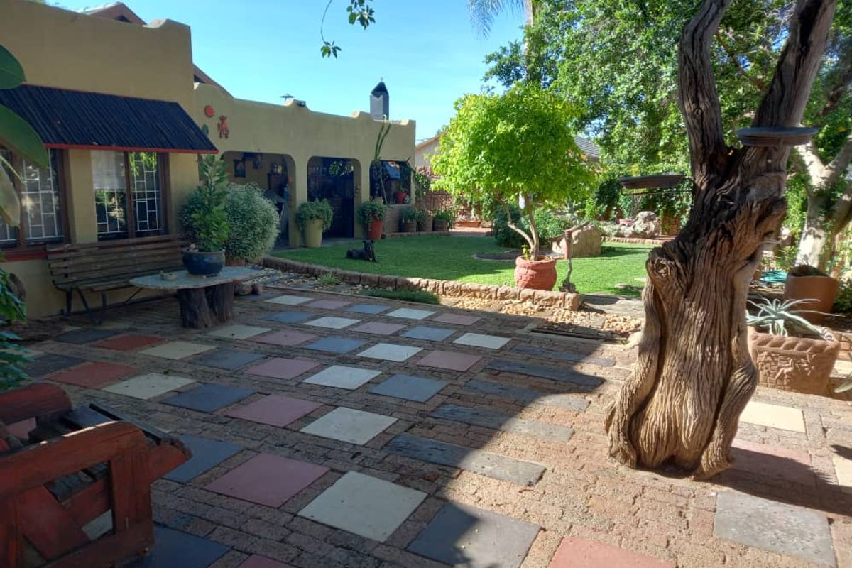 3 Bedrooms, 2 Bathrooms with a separate 1 Bedroom Flat. Kitchen with Scullery and Pantry, Dining Room, Living Room with Fireplace and airconditioner. Entertainment area, as well as lapa and pool with BBQ area. The flat has one bedroom with airconditioner, 1 full bathroom, kitchen and living room. 4 garages, with 2 shaded carports, newly build cool-room and several storerooms. A well-established garden with large trees and a variety of fruit trees, also with 2 rainwater tanks (10 000 and 5 000 liter tanks). The property is private and secure, with lots of extras (hobby room, smoking oven, coal stove) and good security.
