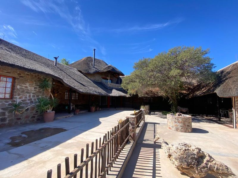 Secluded savannah estate with roaming game, a 16,058‑ha farm featuring a 5,000‑ha electrified game camp, cooler rooms and a double‑story thatched farmhouse with entertainment area; five bedrooms, four bathrooms.
