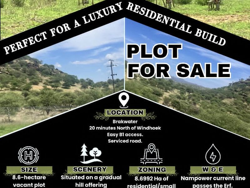 Escape to 8.6 hectares near Windhoek — 20 minutes north via B1 to Brakwater. Gradual hill with sweeping east-west views and roaming game; serviced road and nearby water access.