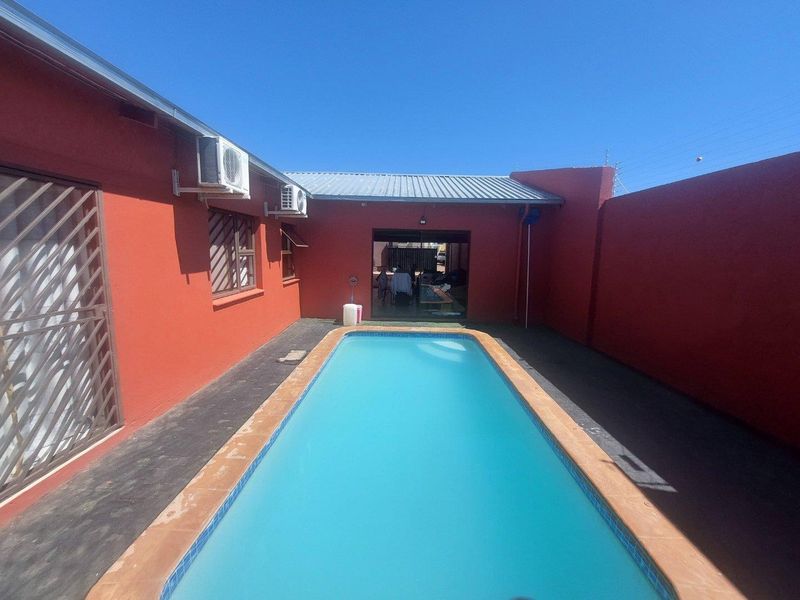 Family-sized home in established Cimbebasia neighborhood offering pool, ample outdoor parking and double garage — five-bedroom main house plus outside room. Needs TLC; renovation potential.