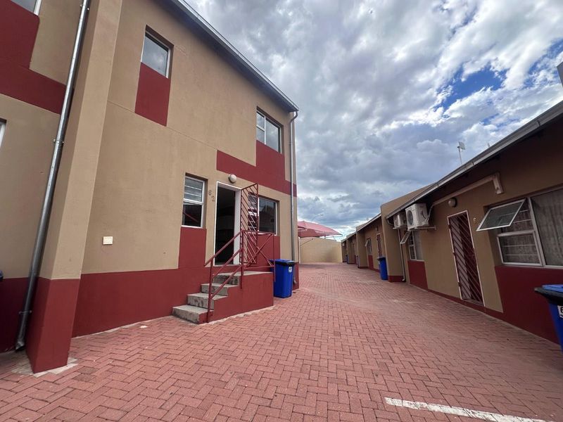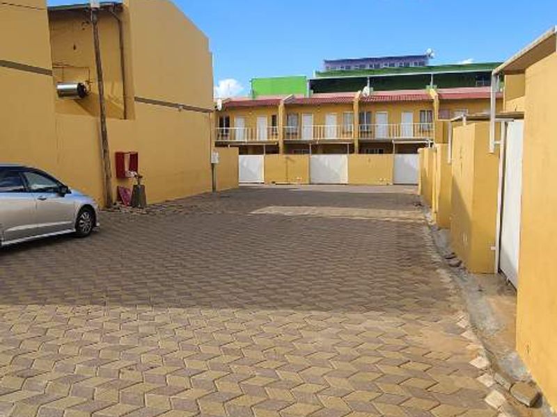 Lock-and-leave duplex near Funky Town Mall and UNAM Khomasdal, offering a paved courtyard and sunny entertainment patio — pet-friendly, two bedrooms, one bathroom, single shaded carport.