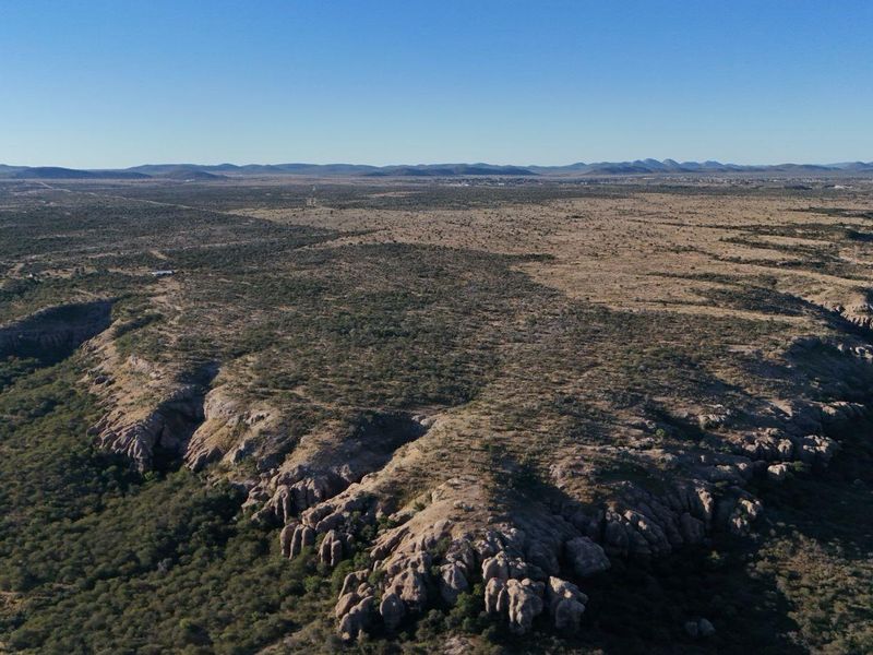 Off-grid retreat 10km outside Outjo with sweeping views and reliable solar power; 110ha ideal for a lodge or campsite, includes borehole and multiple dwellings.