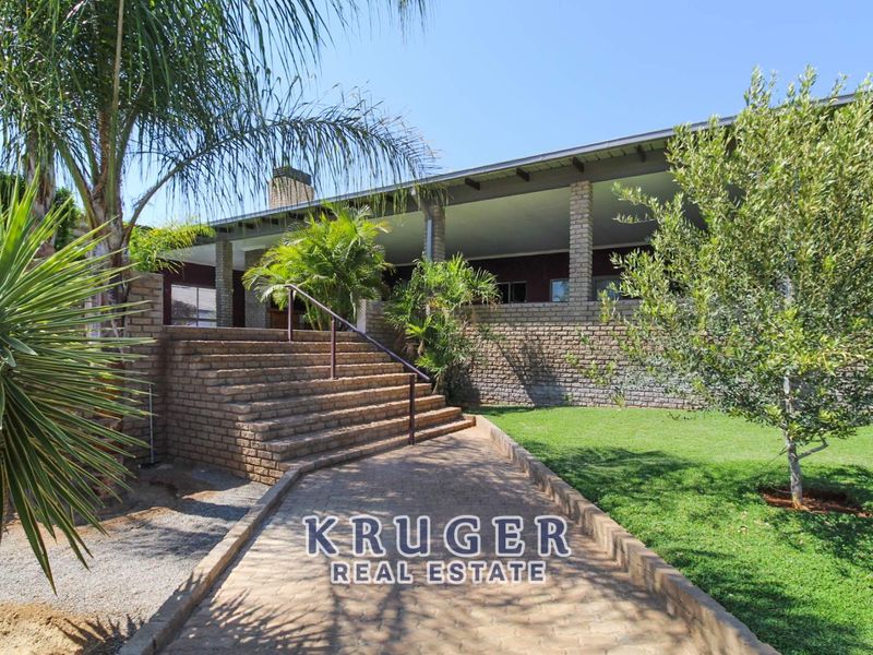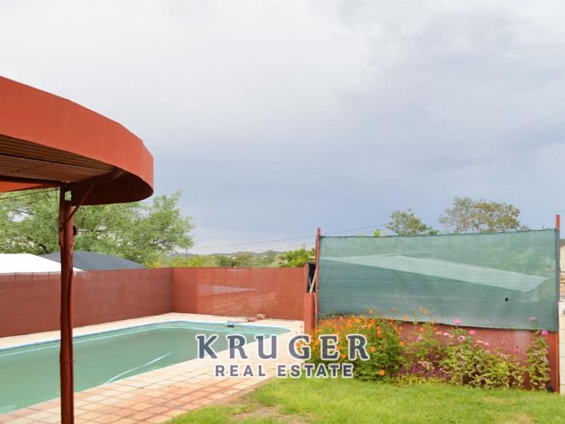 Relaxed family living in Outjo's prime neighbourhood with expansive veranda, mountain views and heated pool; gourmet marble kitchen and five en-suite bedrooms for effortless hosting.