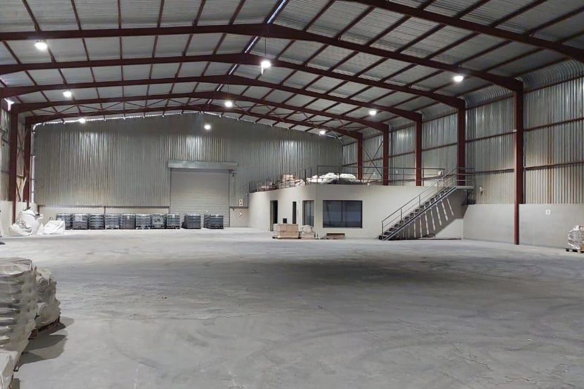 The new warehouse includes a ground-floor open warehouse area, reception space, and main storeroom. Both gender-specific ablution facilities are available along with a kitchenette and various storage areas. The first floor offers a slab storage area, three offices, and a conference & training room.