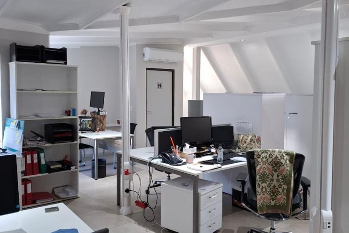 Inside, the office space is thoughtfully laid out with a welcoming reception area, boardrooms, consulting rooms, various offices, ablution facilities, a kitchen, and a secure strong room. The floors are finished with tiles or carpets, providing a professional and comfortable environment. Additionally, the entire building is equipped with split unit air conditioners to ensure optimal comfort.