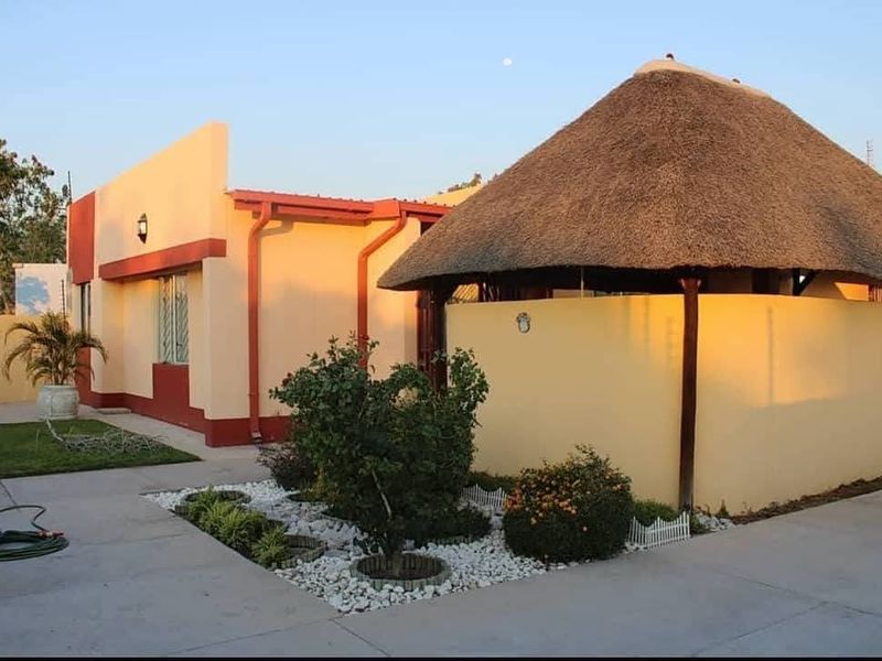 Entertainer's family retreat in Ongwediva Ext 6, near schools and shops, featuring a thatched entertainment area with built-in braai; four bedrooms, three bathrooms and double garage.