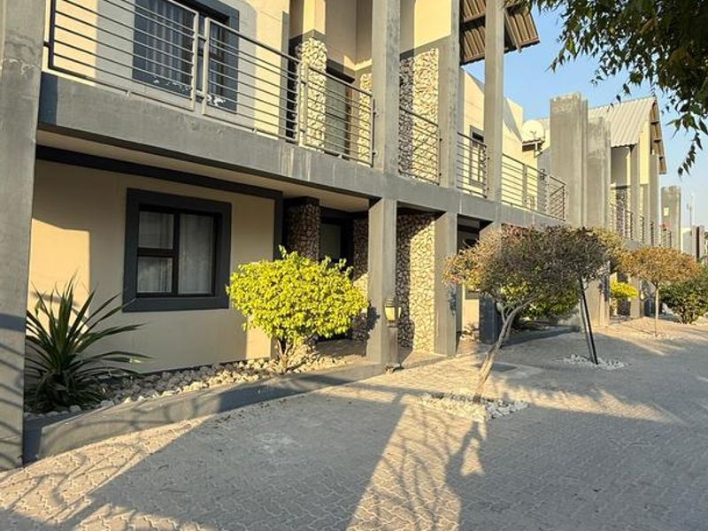 Easy-care village living in Morning Side Village, Ongwediva — close to shops and schools, open-plan lounge and kitchen with low N$950 body corporate (rates included); two bedrooms, one bathroom.