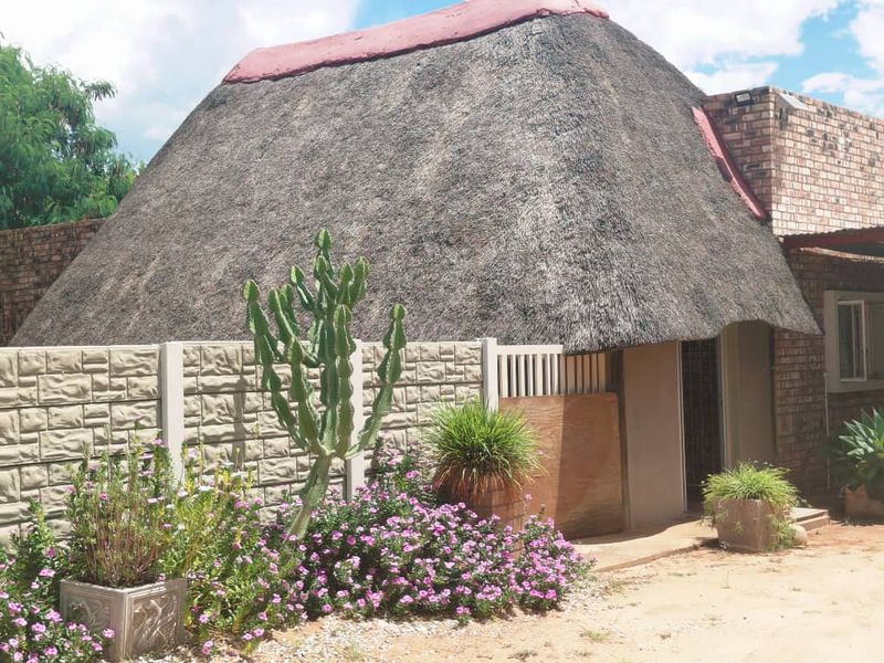 Relaxed family living in Otjiwarongo's friendly setting with a welcoming veranda and lapa for entertaining, unique thatch-and-iron roof, three bedrooms, two bathrooms and a double carport.