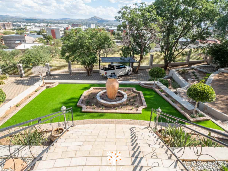 Hillside ambassador-style mansion opposite Windhoek High School, walking distance to the CBD, with pool, tennis court, separate cottage and multiple living areas — 5 beds, 5 baths, 3 garages.