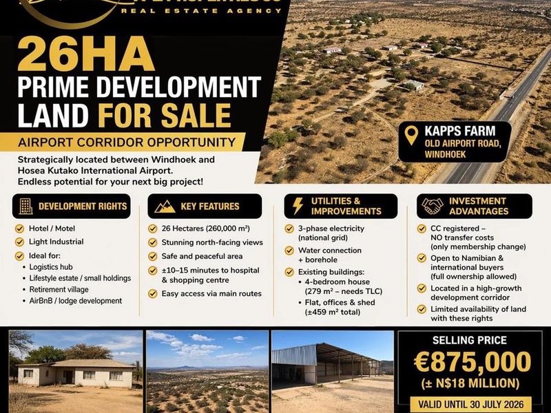 Enjoy strategic convenience between Windhoek and the International Airport, with panoramic views and prime hotel/light-industrial zoningβincludes existing 4-bed, 2-bath house on 26ha.