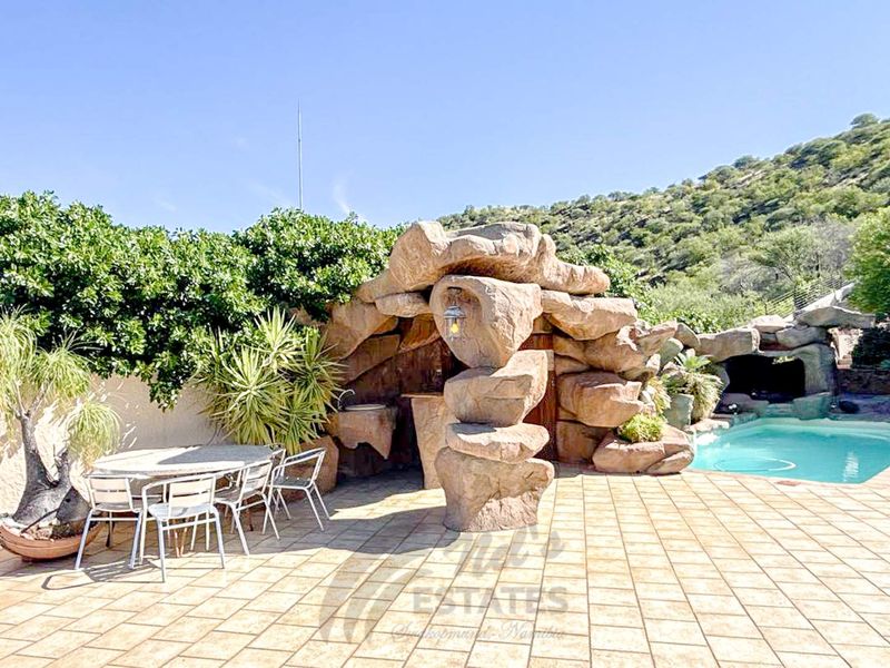 Entertainer's paradise in prestigious Klein Windhoek offering panoramic city views from a thatched patio, underground wine cellar, pool and sauna; includes five-bedroom main home plus two rental flats.