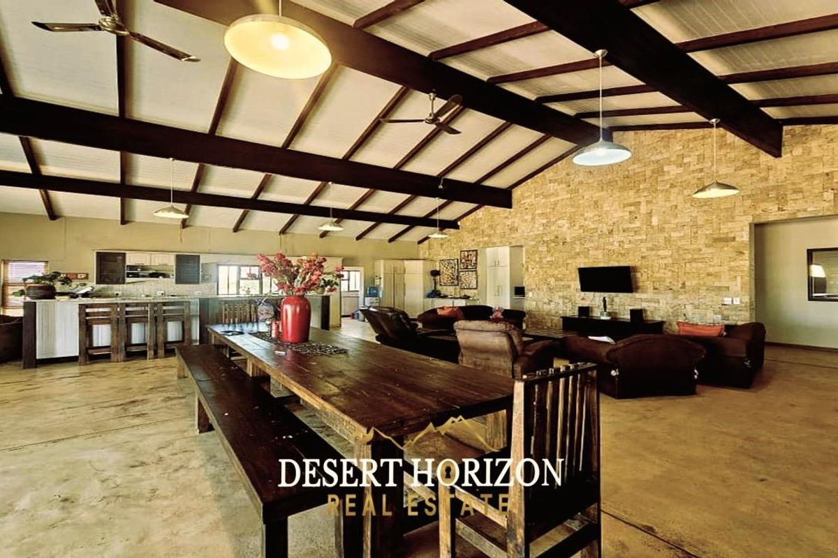 Additional amenities include an attached thatch roof "Outside/Inside" area and a sparkling swimming pool, perfect for entertaining against the backdrop of the Namibian landscape. The indoor BBQ in this spacious entertainment area extends to the pool and a play area for children, making it ideal for family gatherings and celebrations.