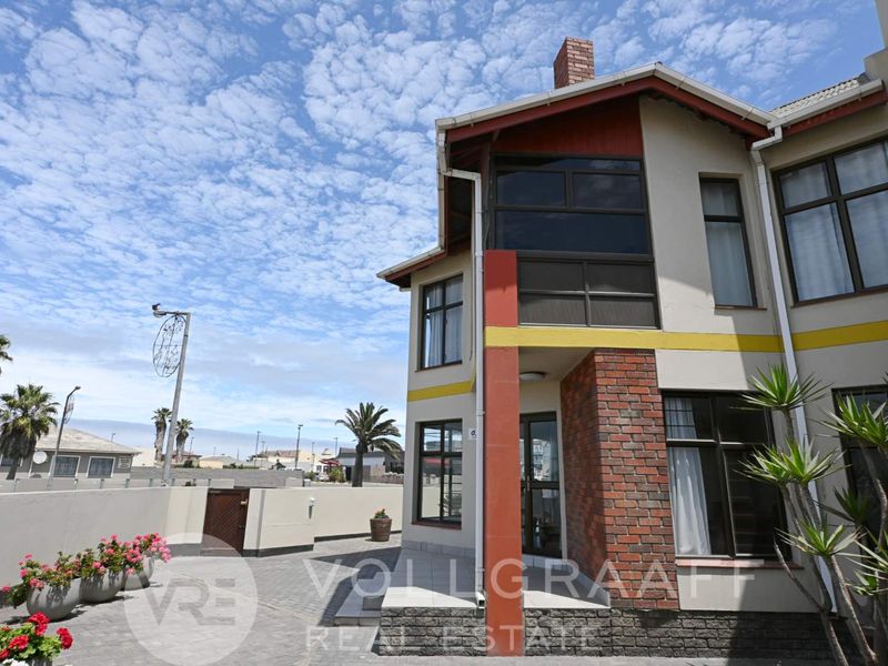 Enjoy urban coastal living and entrepreneurial opportunity in central Swakopmund, steps from shops and restaurants. Four-bedroom townhouse with approved business rights and private courtyard.