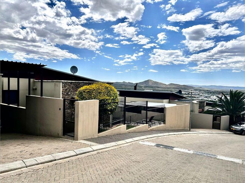 Entertain effortlessly in Henning Village, Klein Kuppe, enjoying Windhoek views from bedroom balconies; soundproof enclosed bar, splash pool, extra one-bed flat, three bedrooms and double garage.