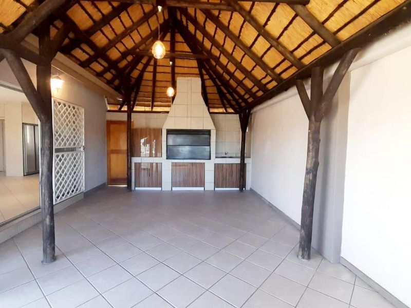 3-bed, 2-bath with kitchen and open living leading to thatched lapa and BBQ. Large garden, courtyard, 1 garage, secure. No pets.