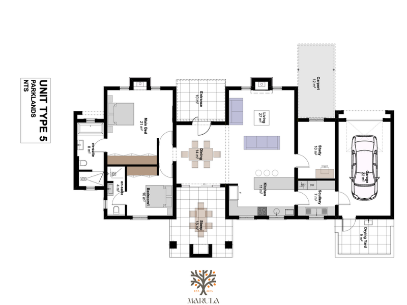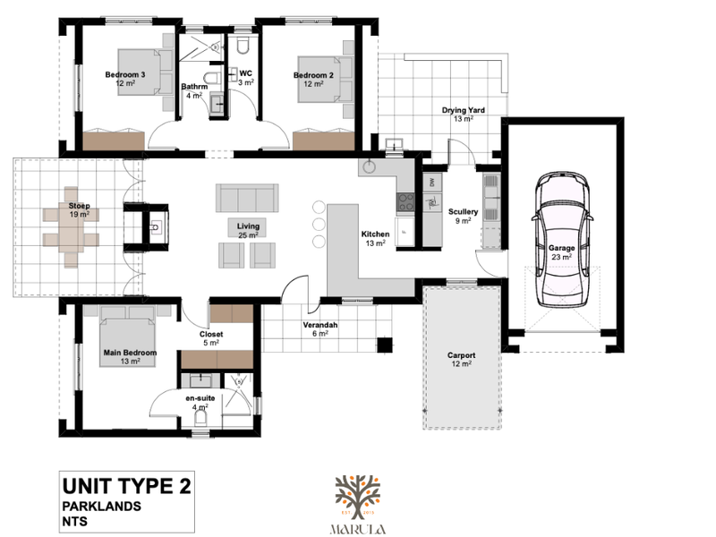 Effortless low-maintenance living in a well-connected neighborhood, featuring an open-plan lounge/kitchen, sunny courtyard, shadenet carport and single garage — two bedrooms, one bathroom.