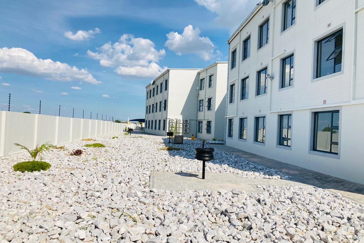 Secure, community-focused living in Namibia with EDGE energy savings, 24/7 CCTV and children's playgrounds; stylish two-bedroom apartment with one bath, covered parking, and first-month rent free.