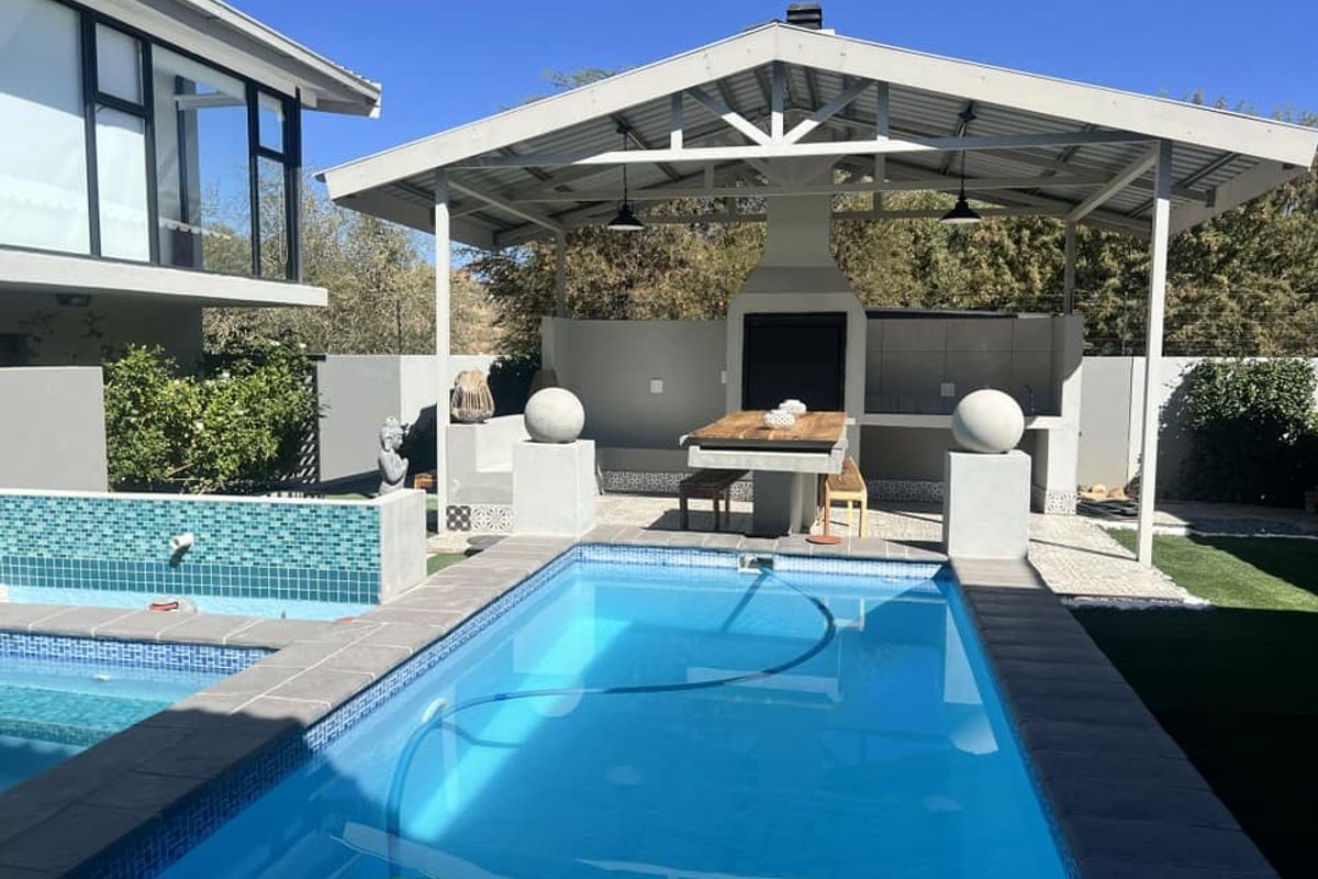 Experience relaxed capital living in Auasblick with resort-style pool, gazebo and boma — fully furnished single-level home with three ensuite bedrooms, staff cottage, study and triple garage.