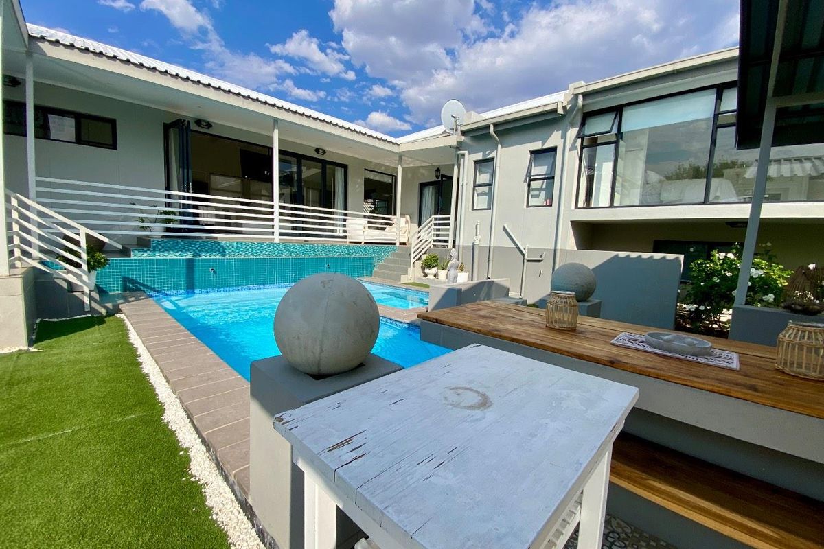 Resort-style entertaining and secure family living in a well-located, gated neighborhood — fully furnished four-bedroom home with private pool, jacuzzi, braai boma and three-car garage.