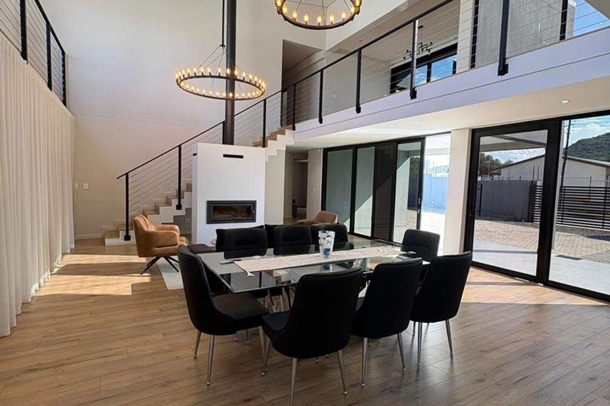 The home boasts a sleek kitchen with elegant white cabinetry complemented by striking black finishes, along with a practical scullery. The dining and sitting areas feature a cozy fireplace and impressive double-volume ceilings, creating an inviting atmosphere.