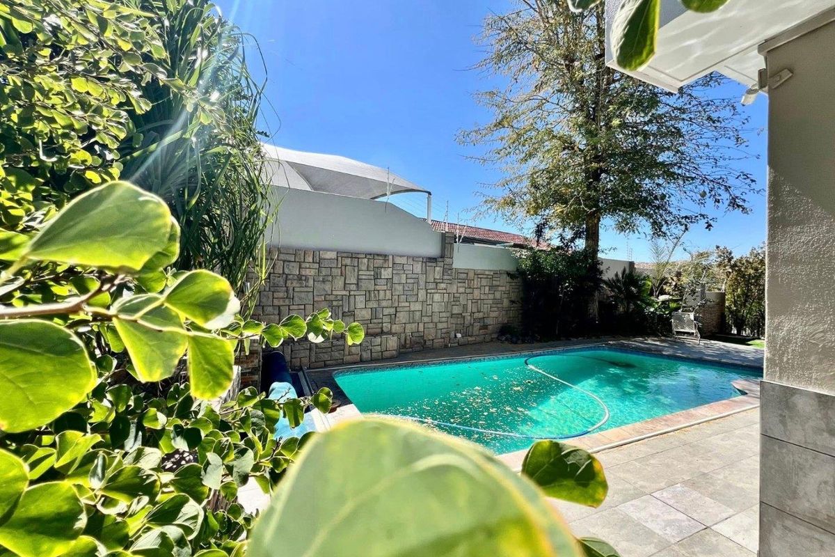 Relaxed family living in Eros Park, Windhoek on a quiet, elevated street — huge indoor entertainment area with indoor BBQ and patio with views. Five bedrooms, four bathrooms, four garages.