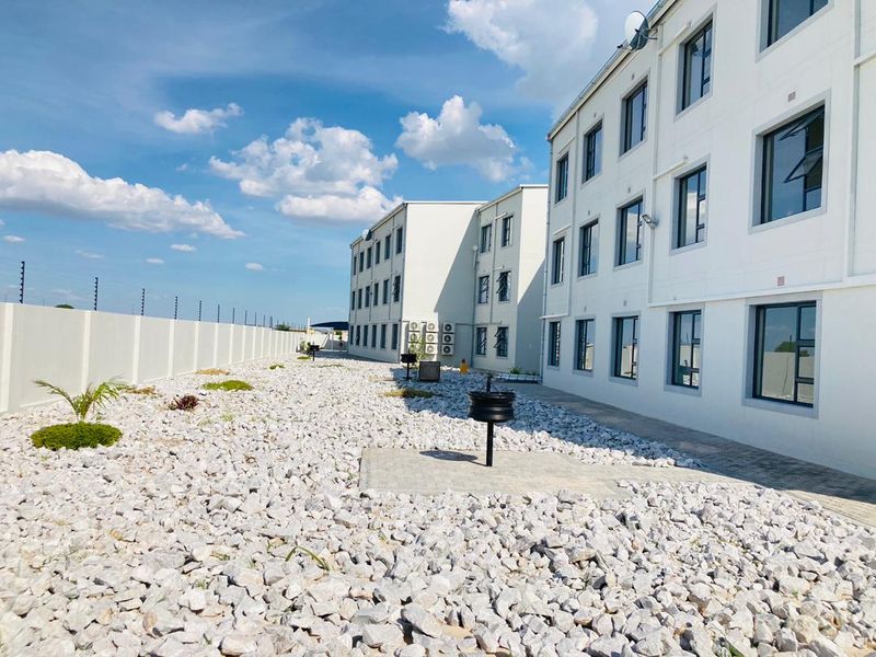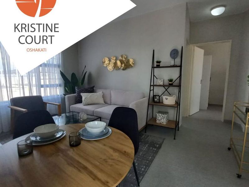 Enjoy central Oshakati living with easy commutes and community amenities at Kristine Court, secure estate featuring playgrounds and braai areas; two-bedroom, one-bath with covered parking.