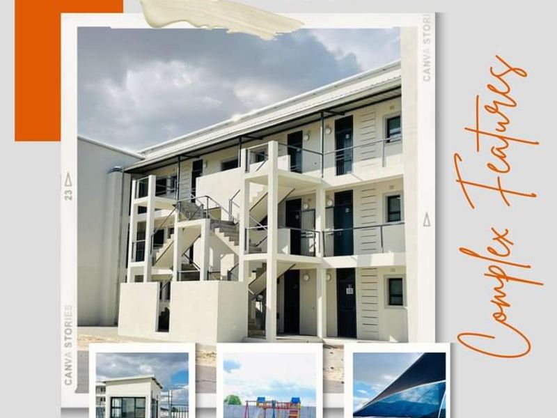 Secure, community-focused living in Namibia with EDGE energy savings, 24/7 CCTV and children's playgrounds; stylish two-bedroom apartment with one bath, covered parking, and first-month rent free.