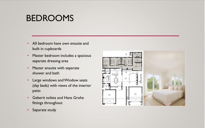 Entertainer's home in an exclusive new development, offering seamless indoor-outdoor living and a landscaped garden. Features exposed wood trusses, open-plan kitchen, three ensuite bedrooms, automated garage.