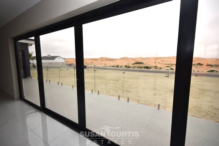 Entertainer's coastal retreat with permanent dune and Swakop River views, south-facing adjacent public space. Expansive multi-zone living, large balcony, mature gardens and fire pit; four beds, four baths, four garages.