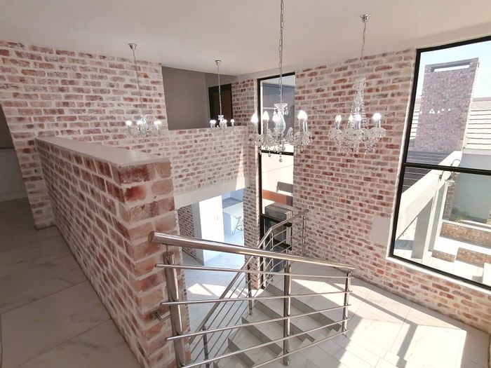 Entertainer's double-storey family haven in a peaceful neighbourhood with bold brick-and-plaster facade, paved driveway to triple automated garages. Covered braai patio with sunken firepit, designer kitchen; five beds, five baths.