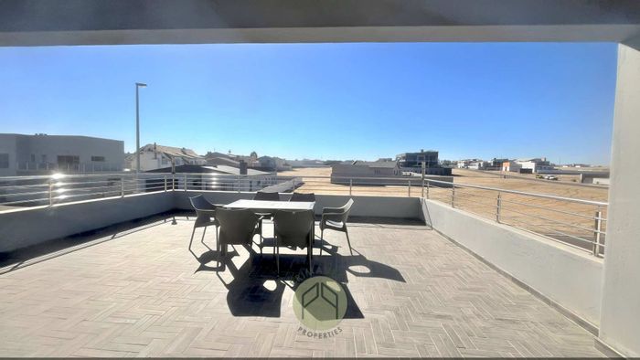 Coastal entertainer's retreat in Swakopmund with ocean-breeze living and seamless indoor-outdoor flow; wood-fired pizza oven and balconies. Five bedrooms, three bathrooms, four garages, spacious flatlet.