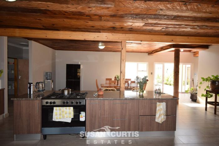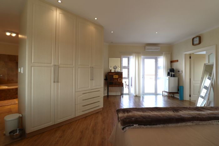 Sea-view double-storey home in a peaceful coastal setting, featuring artisanal solid-wood cupboards, flint-glass windows, indoor braai and glass-roofed solar saltwater pool with sauna. 4 beds, 3 baths, 3 garages.