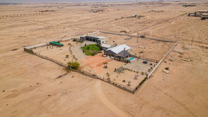 Desert farm-style retreat on 3.04 ha Swakop River plots, walled for privacy — single-story living with braai entertainment room, study and dressing room; 3 beds, 3 baths, 4 garages.