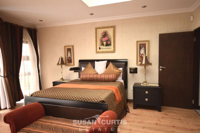Spacious double storey home with 6 bedrooms, 5 bathrooms, multiple living areas, guest suite, flat, rooftop views, and security features.