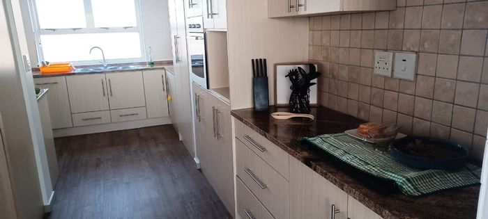 Ground floor unit with three bedrooms, living area, balcony, double garage, and included furniture for N$ 3,675,000.