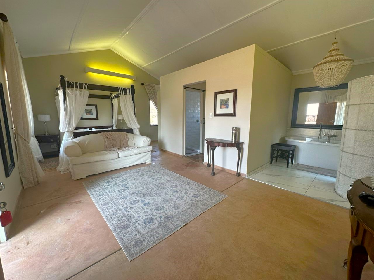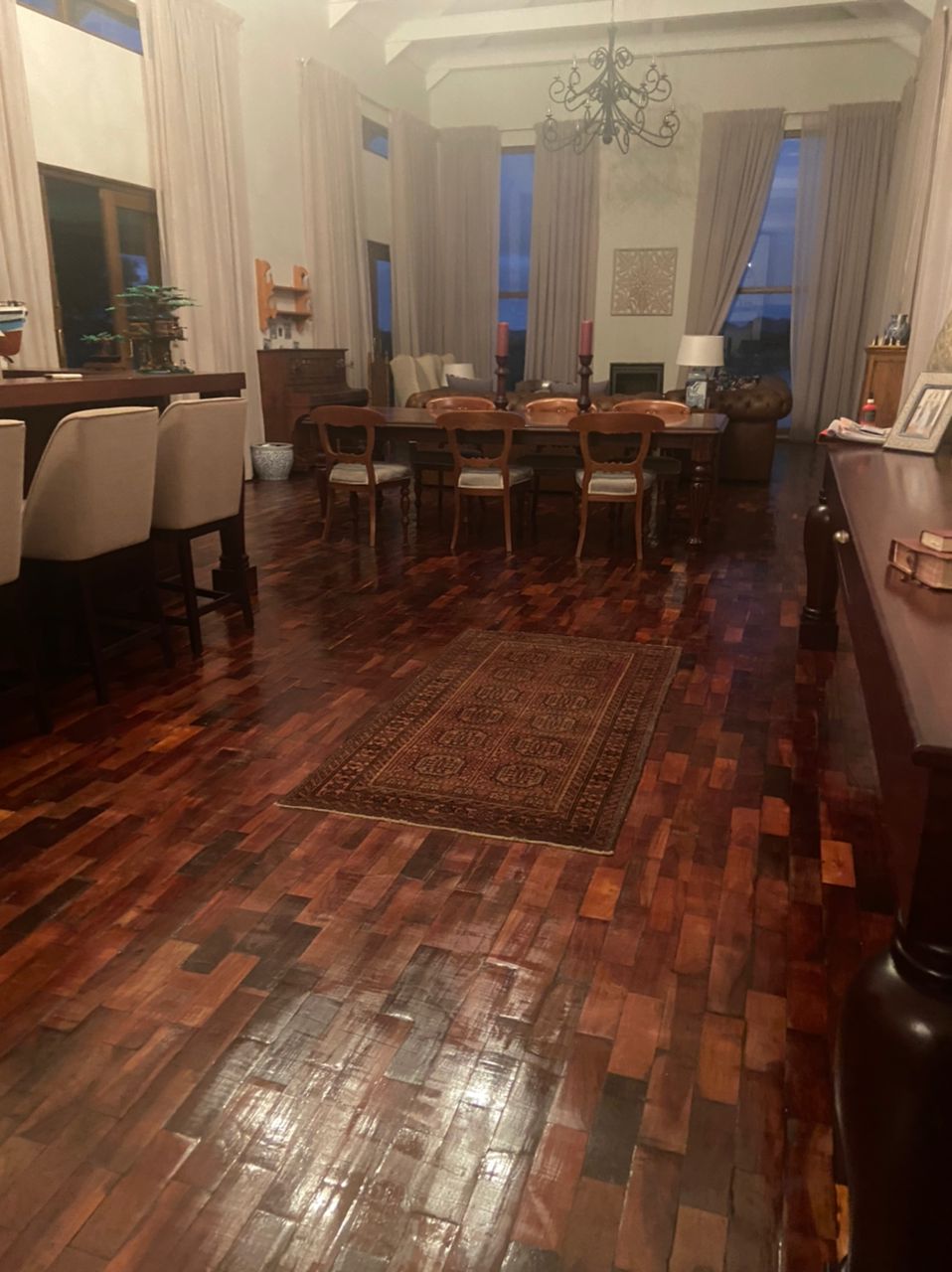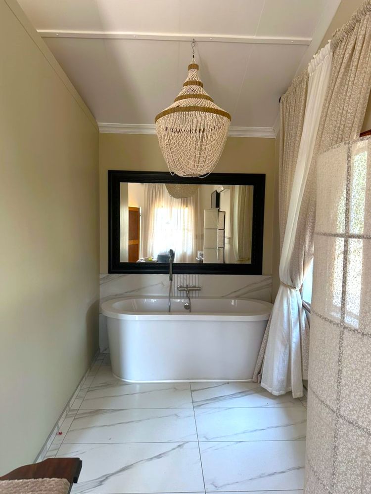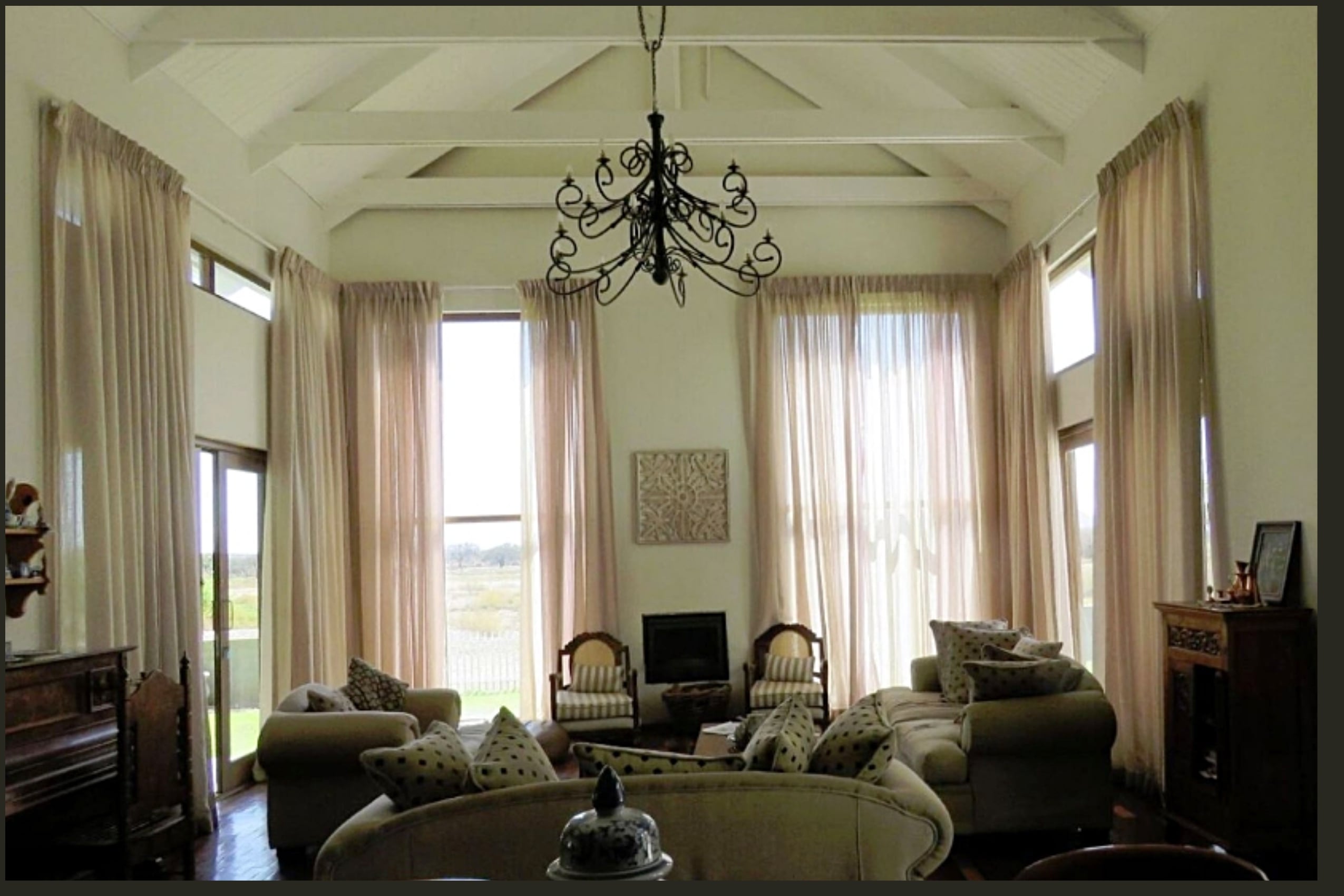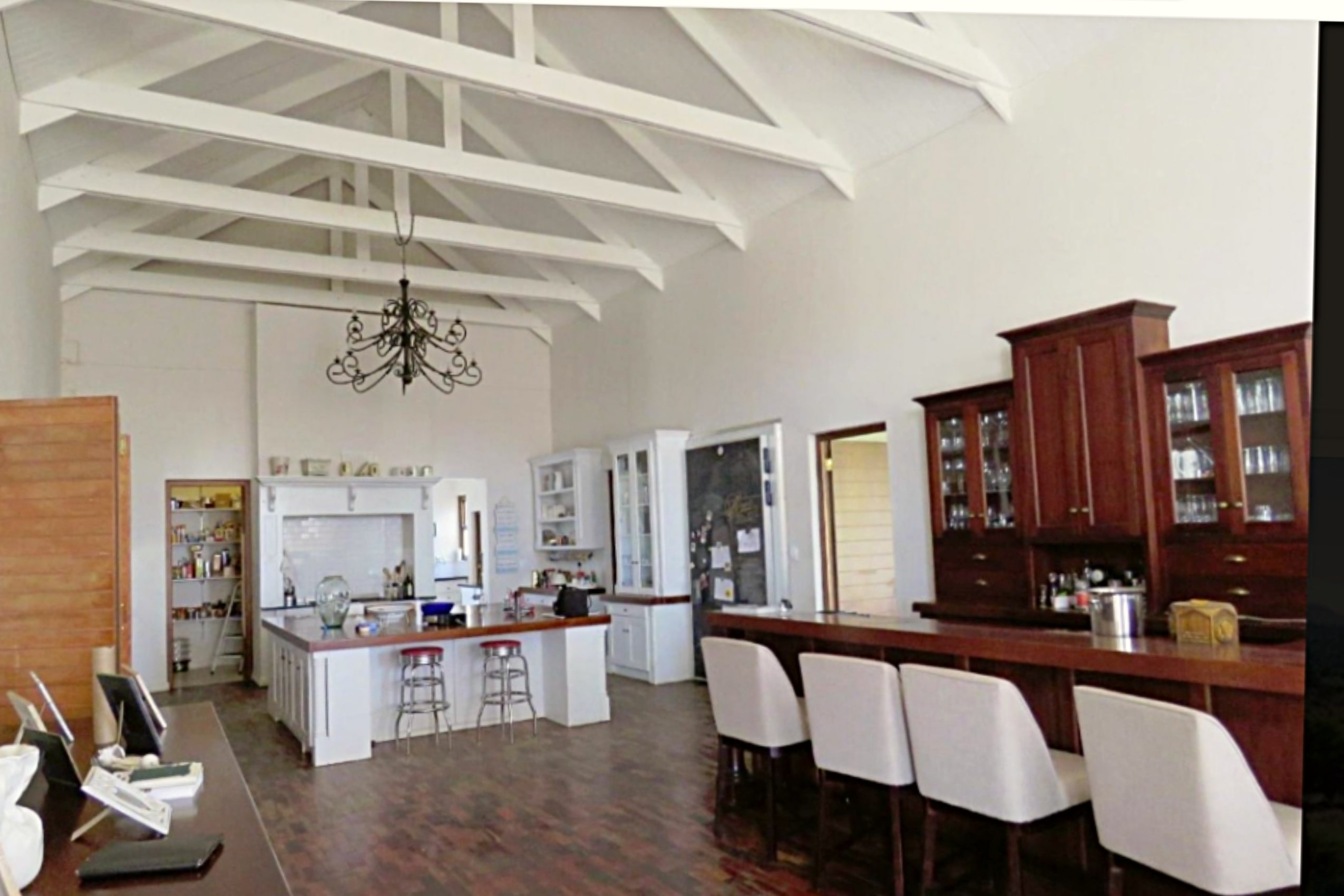 Entertainment Ready with Kiaat wood bar with under-bar fridge, rose and herb gardens, patio with outdoor BBQ. Double-volume ceilings, exposed wood trusses, and elegant pendant and chandelier lighting create a warm, inviting ambiance.
