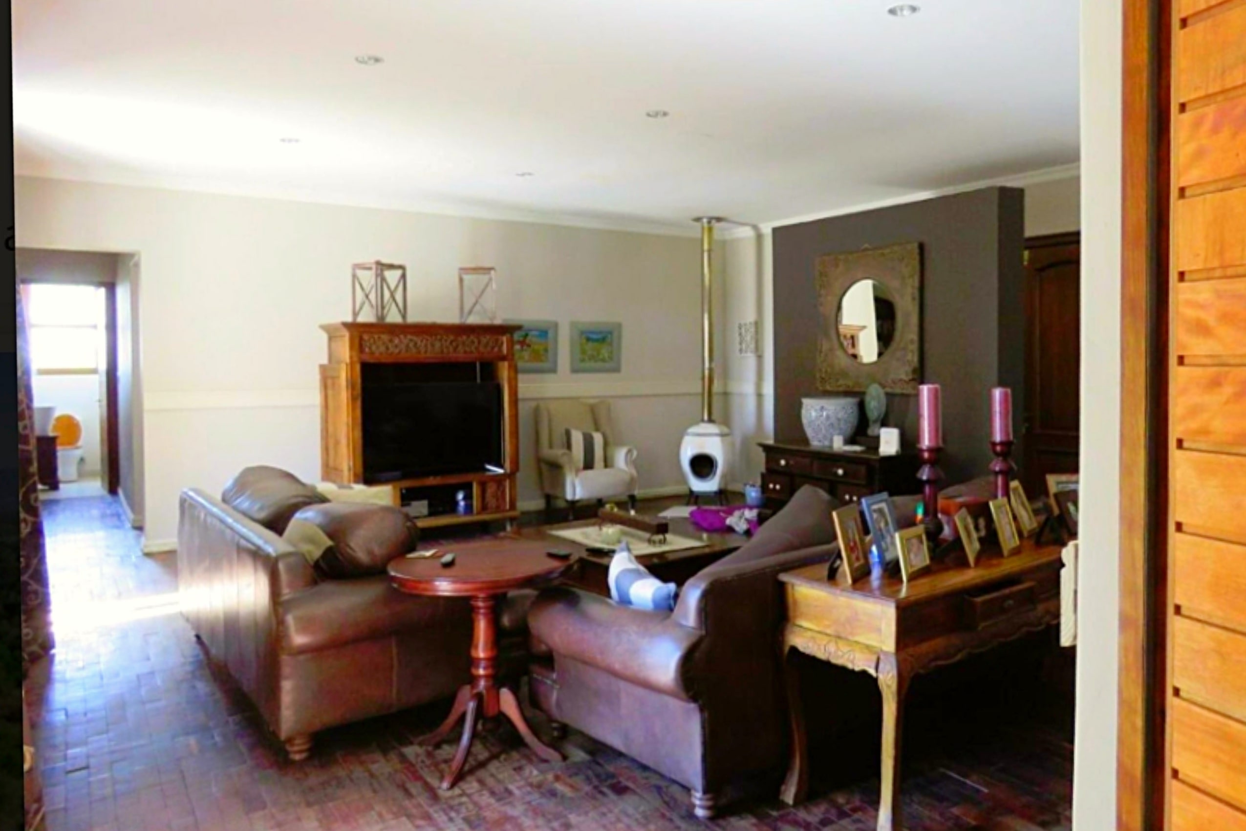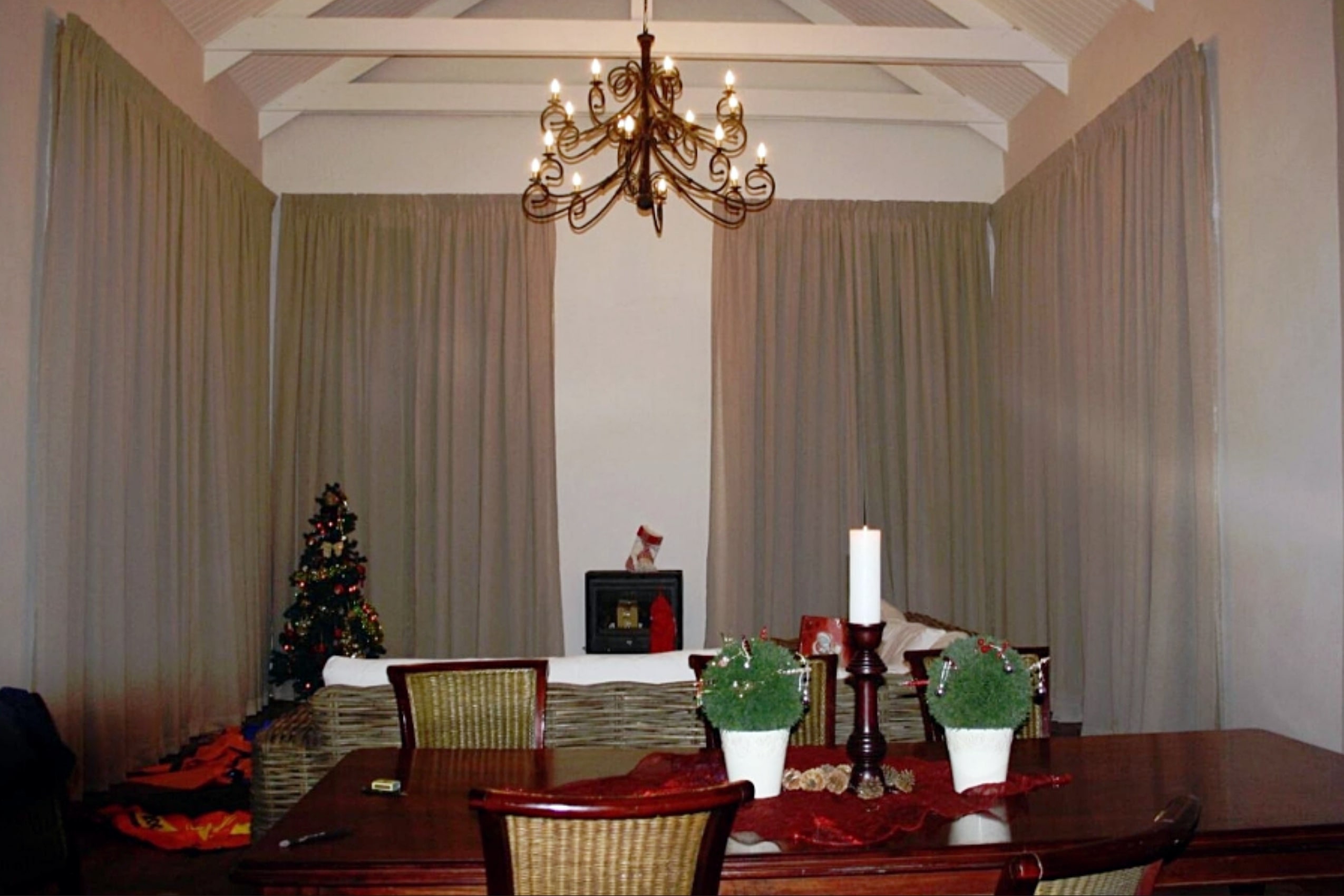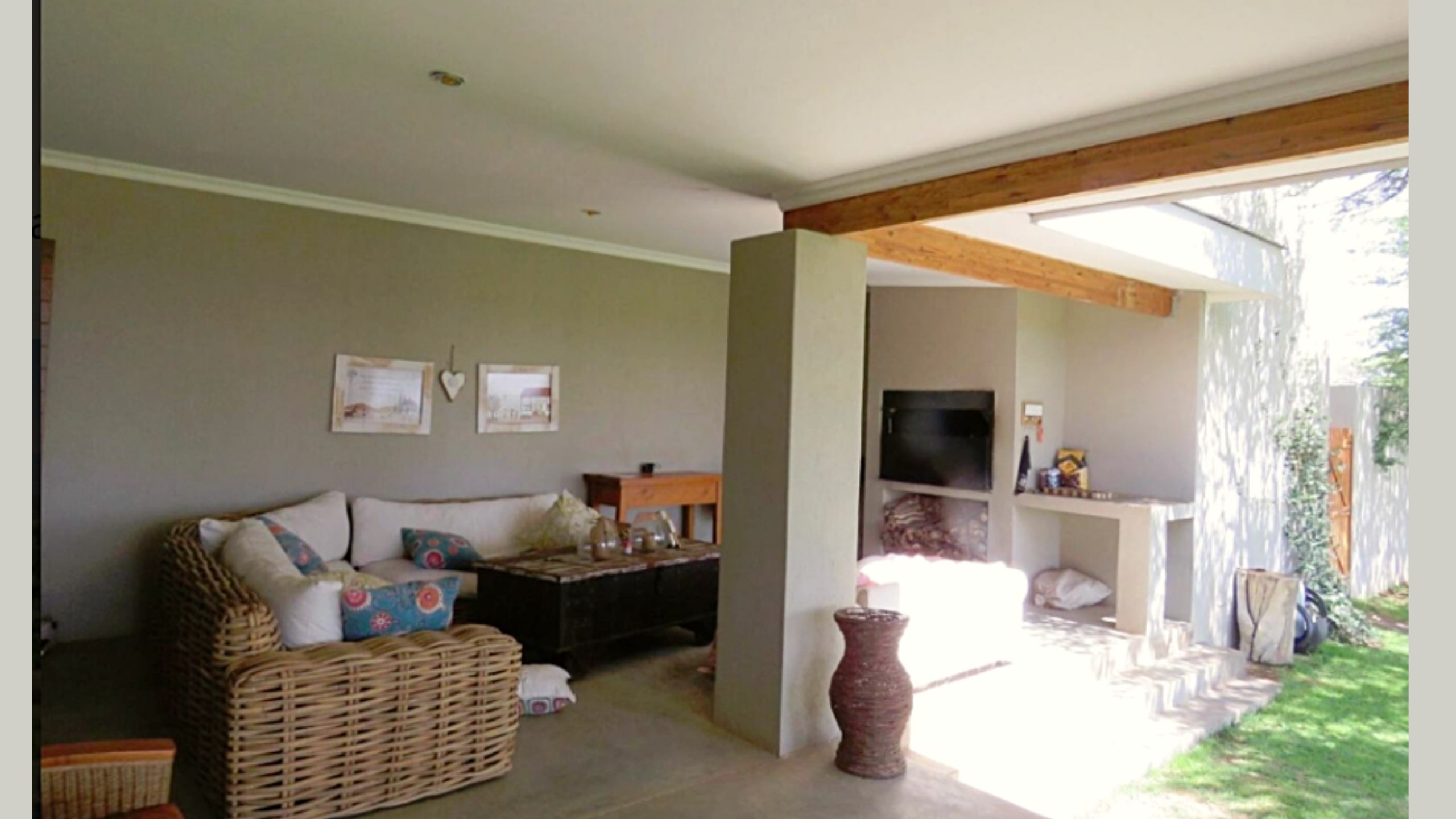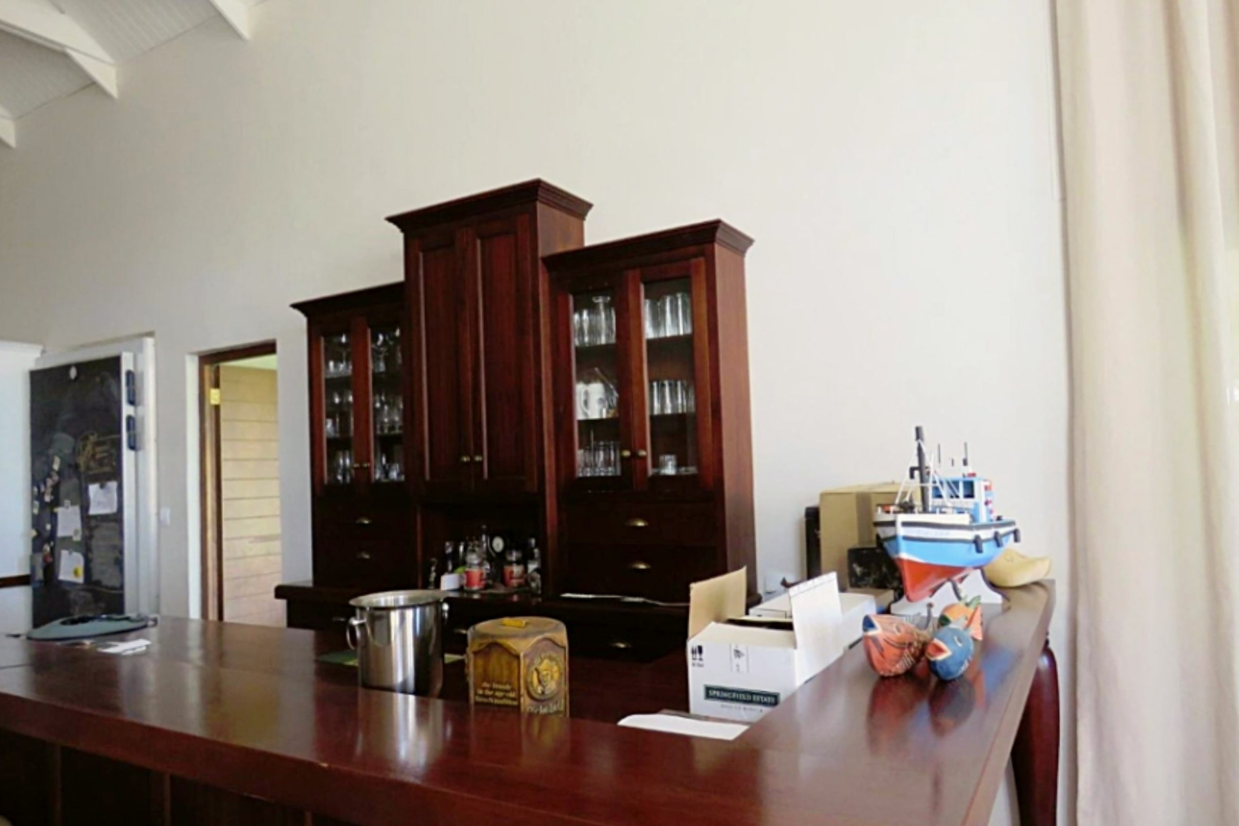 Entertainment Ready with Kiaat wood bar with under-bar fridge, rose and herb gardens, patio with outdoor BBQ. Double-volume ceilings, exposed wood trusses, and elegant pendant and chandelier lighting create a warm, inviting ambiance.