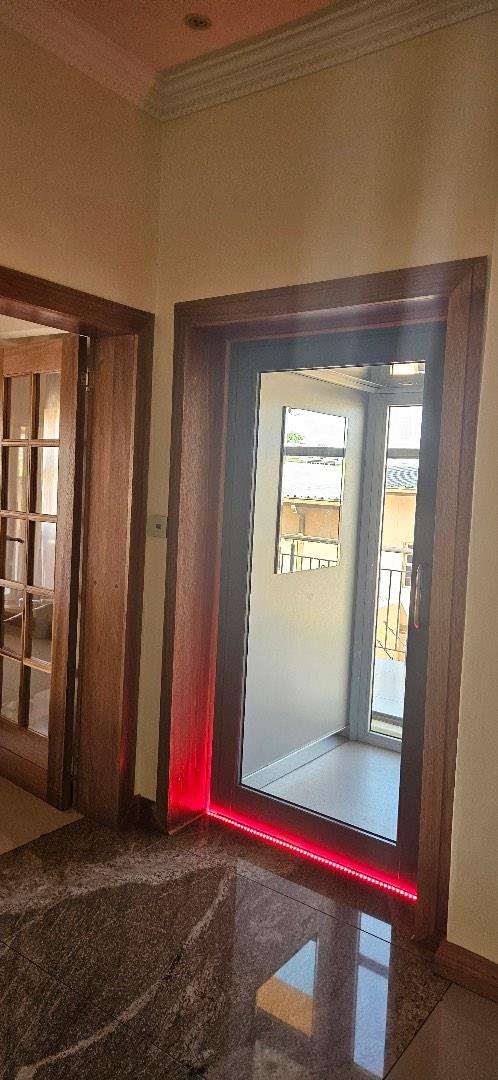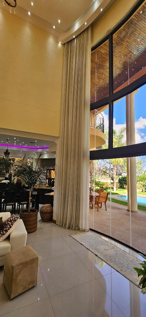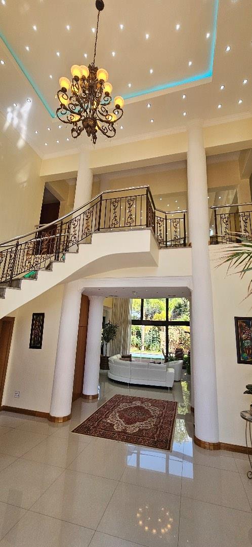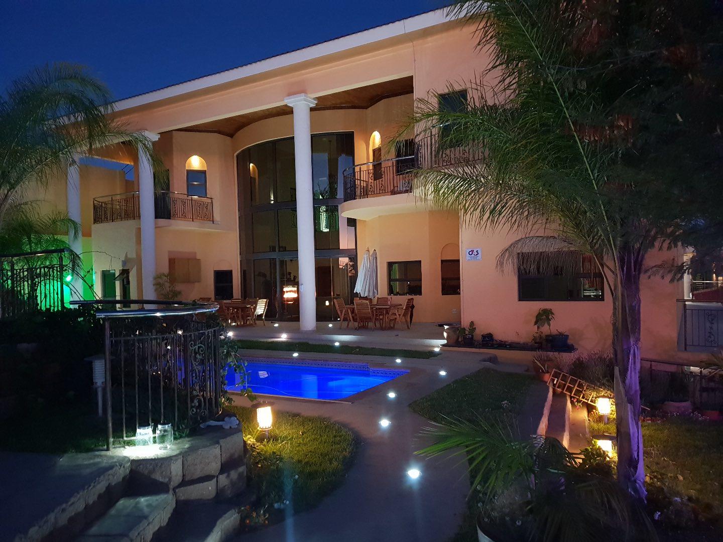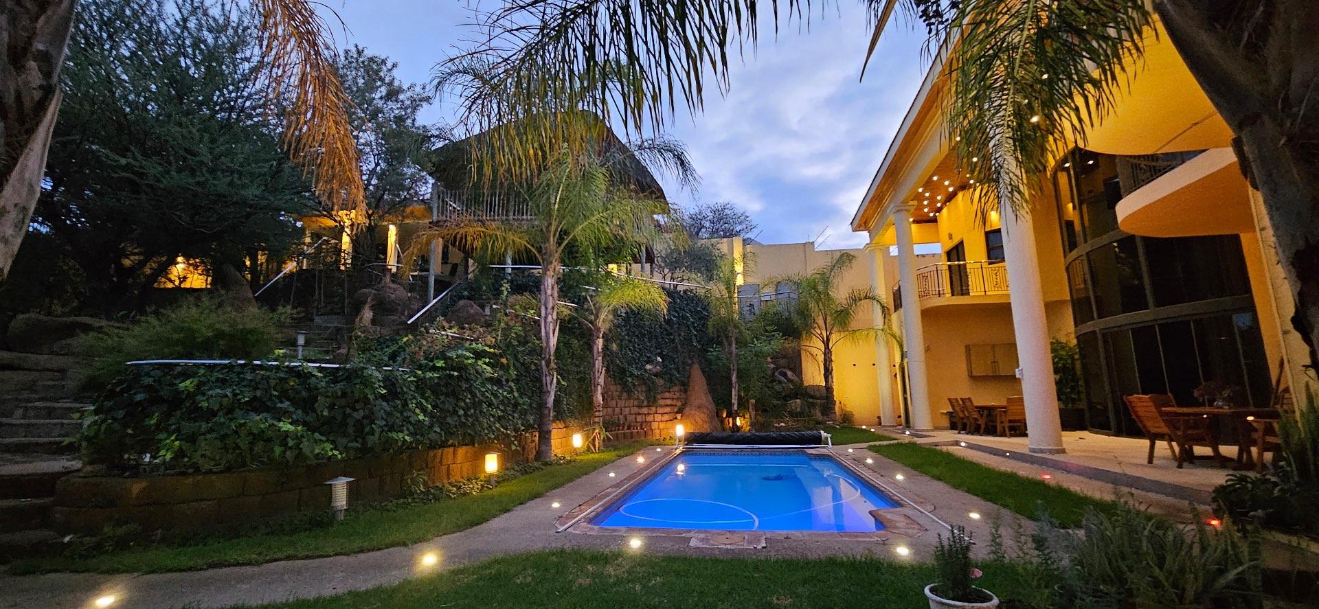 This highly exclusive lifestyle sale offering home, comes fully automated, featuring Keyless Biometric Access Control, and High-Definition Living environments. The Villa is situated in an exclusive, luxury and highly secure presidential neighbourhood. It comes with a domestic house lift for access of the 3 levels of luxury living environments, featuring 3 circuits networks of only LED automated multi-lighting systems and 4 levels of security barriers. This over 700m2 build-up area, situated on over 1600m2 land, offers luxury inside living environments of a double volume entrance foyer, double volume sitting room with a grand gas fireplace, aircons, open plan dining, 6 in-suite with inbuilt storage spaces and large balconies with views bedrooms, top floor morning kitchen, outside sauna room with bathroom facilities, laundry, office, large kitchen, wine cellar, 3 garages and carports with a top deck connected to the Cinema Room and many more features. The outside luxury story of this Villa is completed and supported by a secure pedestrian and royal vehicle entrance gates, grand front staircase entrance and highly private large back garden areas with mature fruit trees and a number of natural bushes and Acacia trees supporting a variety of birdlife. This exclusive lifestyle Villa offers great sunsets views of the City of Windhoek, the Auas Mountains and the Grand State House, and all in the immediate backdrop of the double level African styled thatched Gazebo (Lapa) with BBQ facilities, a private fully equipped gym with ablution facilities, a very large swimming pool and a grand and majestic water fall feature.