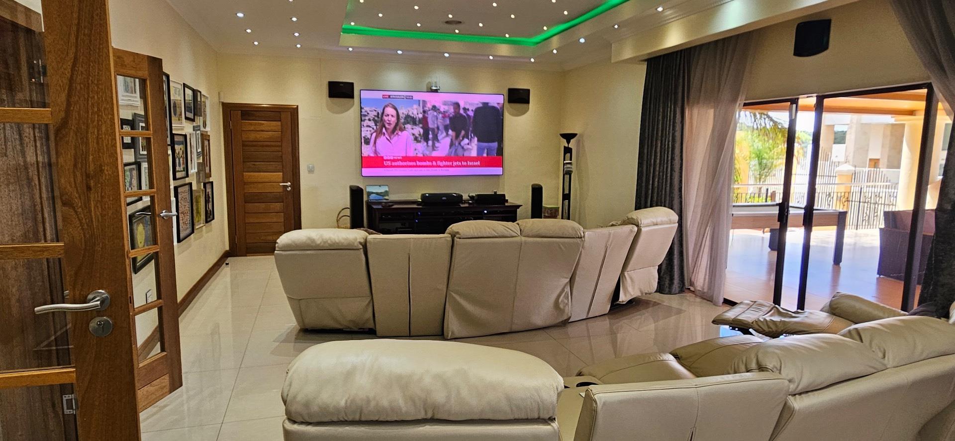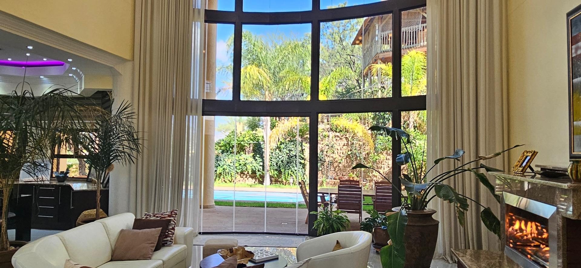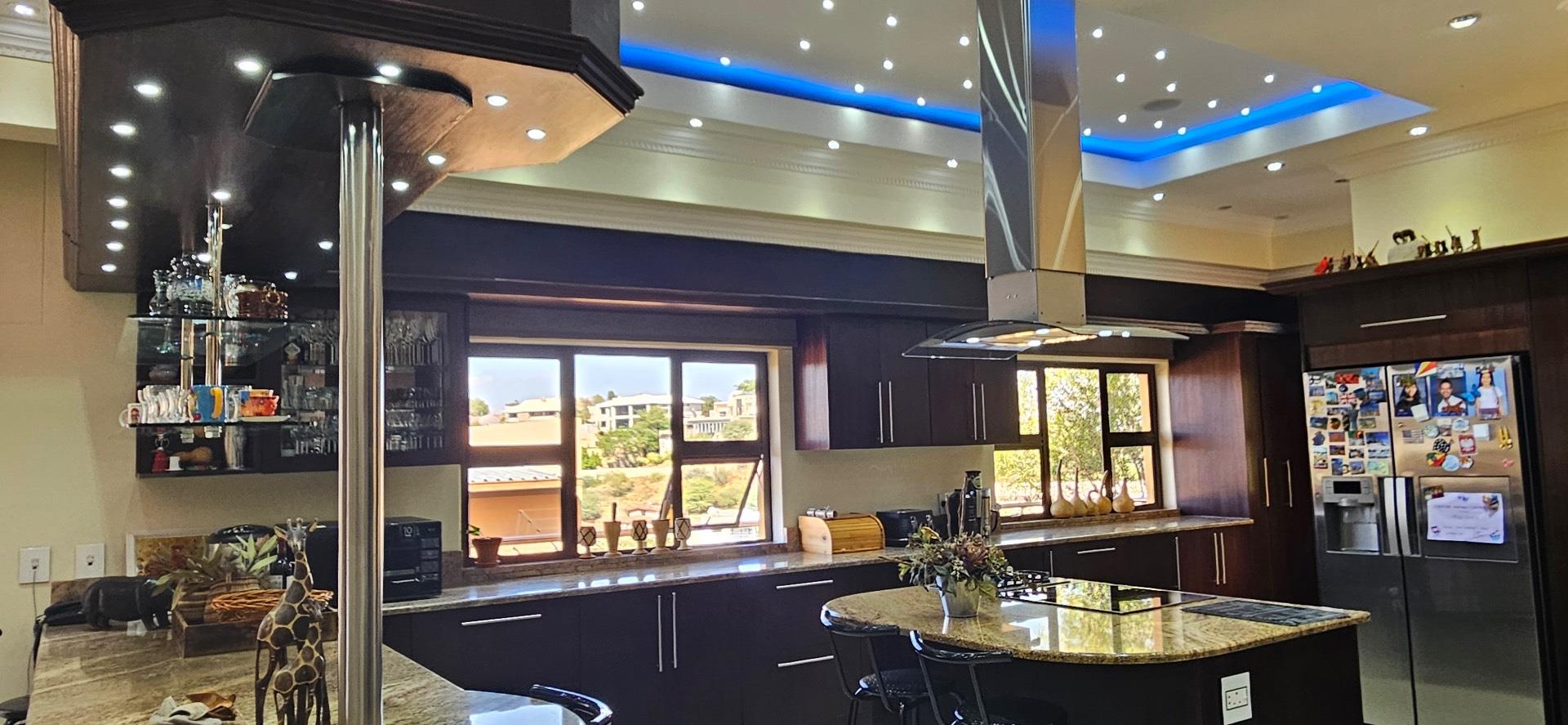 This highly exclusive lifestyle sale offering home, comes fully automated, featuring Keyless Biometric Access Control, and High-Definition Living environments. The Villa is situated in an exclusive, luxury and highly secure presidential neighbourhood. It comes with a domestic house lift for access of the 3 levels of luxury living environments, featuring 3 circuits networks of only LED automated multi-lighting systems and 4 levels of security barriers. This over 700m2 build-up area, situated on over 1600m2 land, offers luxury inside living environments of a double volume entrance foyer, double volume sitting room with a grand gas fireplace, aircons, open plan dining, 6 in-suite with inbuilt storage spaces and large balconies with views bedrooms, top floor morning kitchen, outside sauna room with bathroom facilities, laundry, office, large kitchen, wine cellar, 3 garages and carports with a top deck connected to the Cinema Room and many more features. The outside luxury story of this Villa is completed and supported by a secure pedestrian and royal vehicle entrance gates, grand front staircase entrance and highly private large back garden areas with mature fruit trees and a number of natural bushes and Acacia trees supporting a variety of birdlife. This exclusive lifestyle Villa offers great sunsets views of the City of Windhoek, the Auas Mountains and the Grand State House, and all in the immediate backdrop of the double level African styled thatched Gazebo (Lapa) with BBQ facilities, a private fully equipped gym with ablution facilities, a very large swimming pool and a grand and majestic water fall feature.