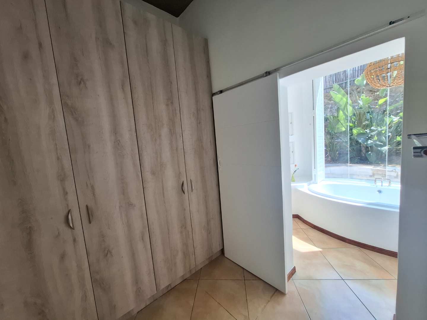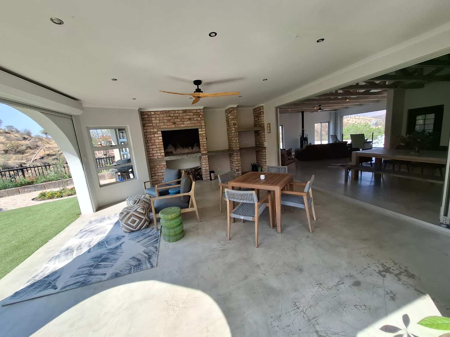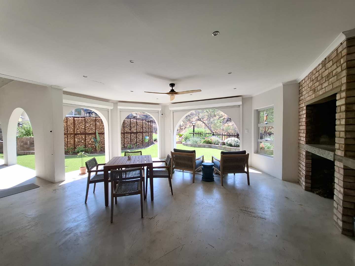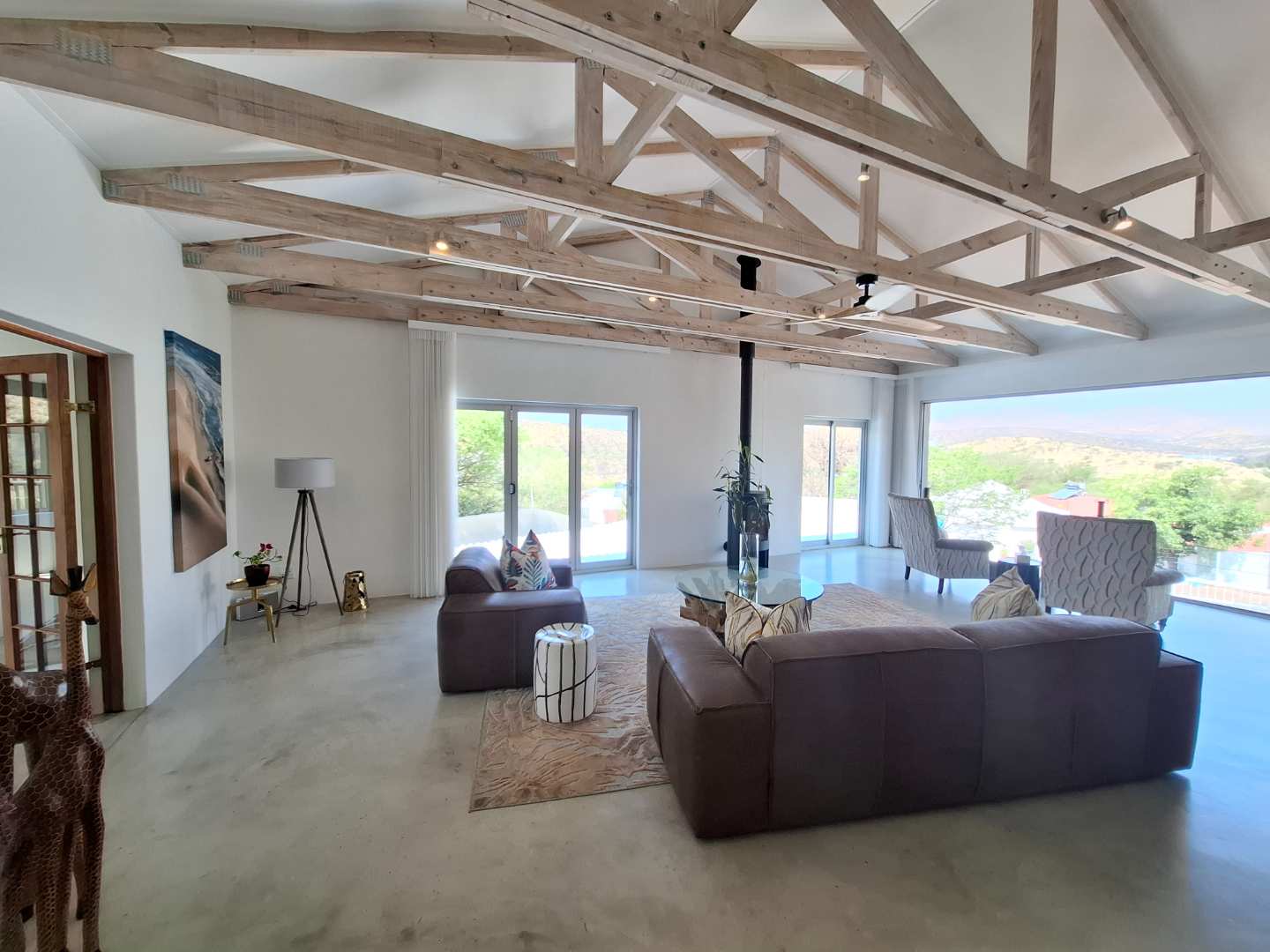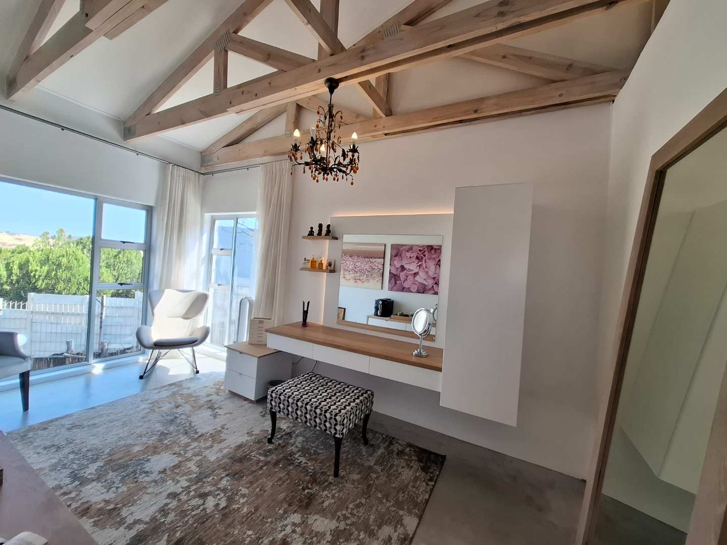 Set in a quiet cul-de-sac and meticulously maintained to exacting German standards, this move-in-ready residence offers the perfect blend of luxury, privacy, and functionality. Elevated to take full advantage of the panoramic views, the home boasts top-quality, earthy finishes throughout. The property features four generously sized bedrooms and three full bathrooms, with two en-suite bedrooms. The master suite is truly exceptional—stack-away doors on both sides open up to unparalleled views, creating an atmosphere that rivals the most luxurious honeymoon suite. The en-suite bathroom is equally impressive, offering a double vanity, oversized shower, freestanding bath, and a walk-in dressing room. An upstairs study also enjoys sweeping vistas, while a guest cloakroom adds convenience on the ground floor. The farm-style kitchen is the heart of the home, equipped with a freestanding gas stove and a spacious scullery/laundry area. Expansive, open-plan living areas are air-conditioned and centered around a cozy fireplace. Stack-away doors open fully to the outdoors, allowing for seamless indoor-outdoor flow and an immersive connection with nature. A separate TV room provides a dedicated space for family entertainment. The covered patio, featuring a large built-in BBQ, overlooks a beautifully landscaped garden and expansive deck surrounding a heated pool—ideal for sundowners, weekend gatherings, or relaxed family time. Mature palm trees add to the tranquil ambiance. For guests, a fifth bedroom in African tented style—complete with its own en-suite bathroom—offers a unique and luxurious retreat. Additional features include: Staff quarters (easily repurposed as a gym), Four garages with a workshop, Multiple storerooms, Wine cellar. Security is outstanding, with a state-of-the-art alarm system, electric fencing, CCTV surveillance, American shutters, and more.